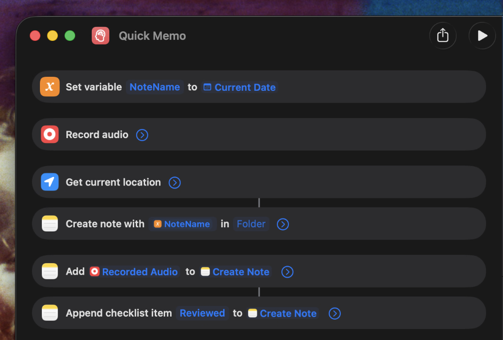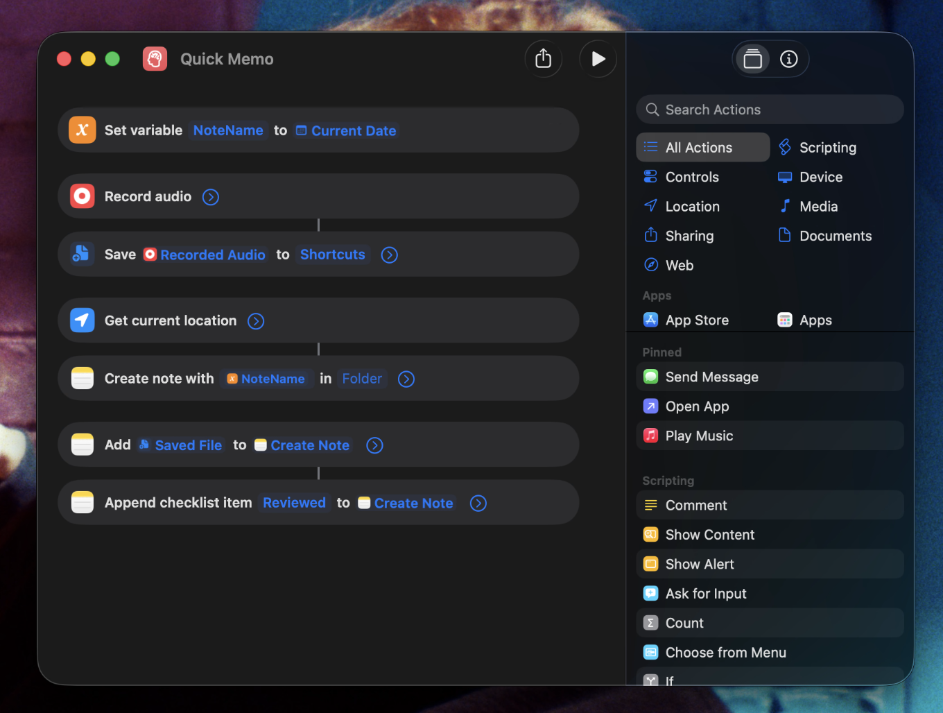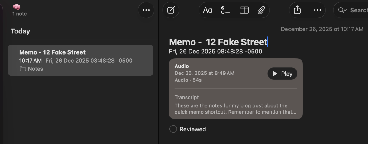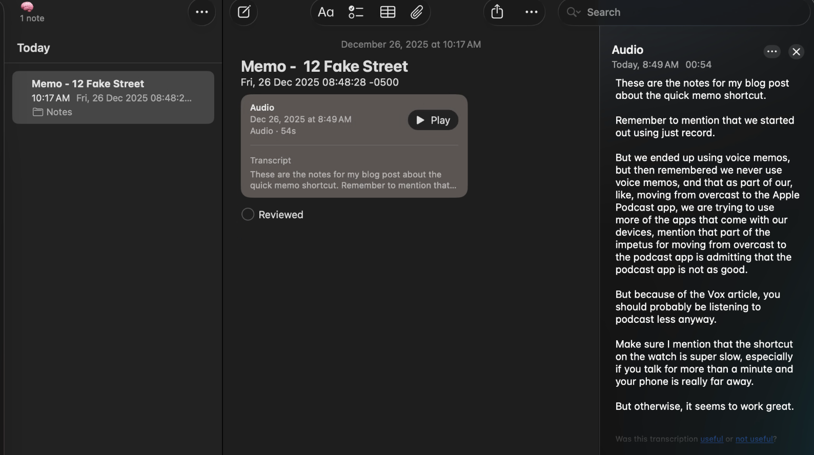 A Wild Notes.app Appeared: While working on this Shortcut, I saw some actions for Notes, which also recently got audio recording and transcription...