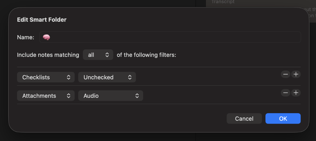 Then, using Smart Folders, I collect every note with audio attached and any unchecked checkboxes: