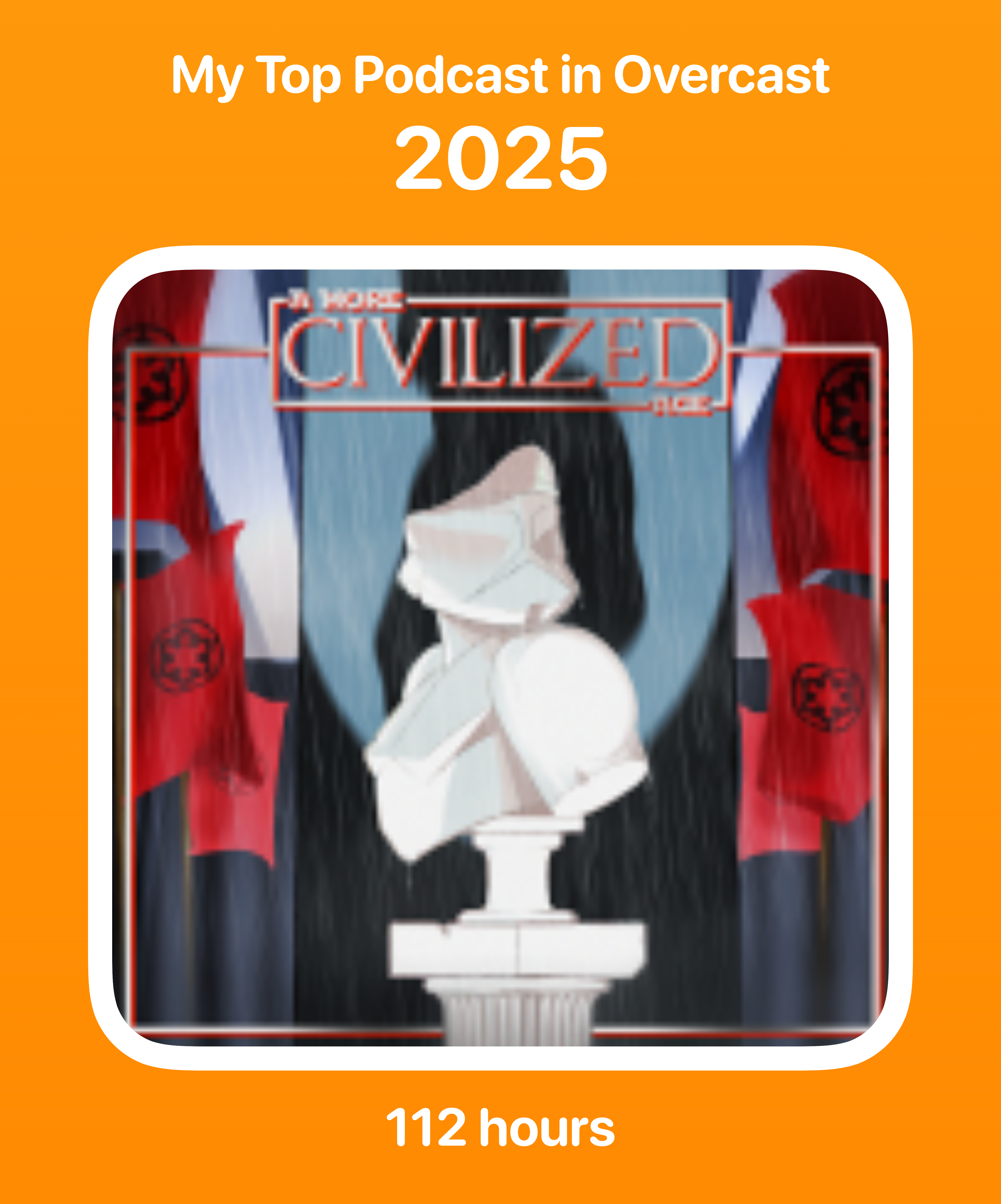 A friend recommended the Star Wars podcast A More Civilized Age to me a year or so ago and it has completely consumed my podcast listening time. I listened to their Star Wars Rebels coverage when we were isolating after Ripley's transplant back in January. I've been following their KOTOR 2 playthrough (including the actual footage of gameplay on their Youtube channel) this fall and with that now over, I've jumped back to 2021 and started listening to their Star Wars Clone Wars coverage.