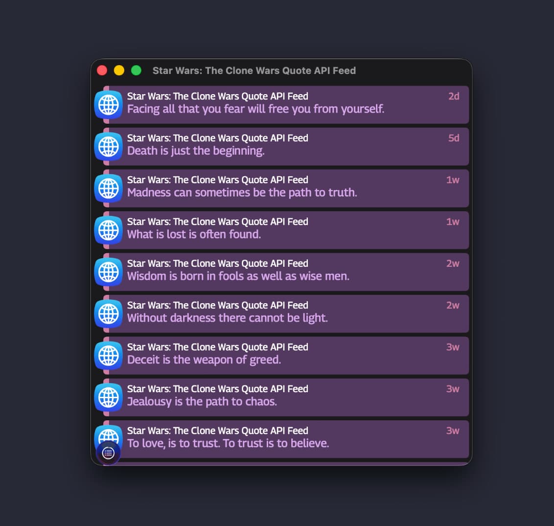 TDLR: I built an API that returns quotes from Star Wars: The Clone Wars as either JSON or RSS. You can find it at wisdom.ferrell.rocks.